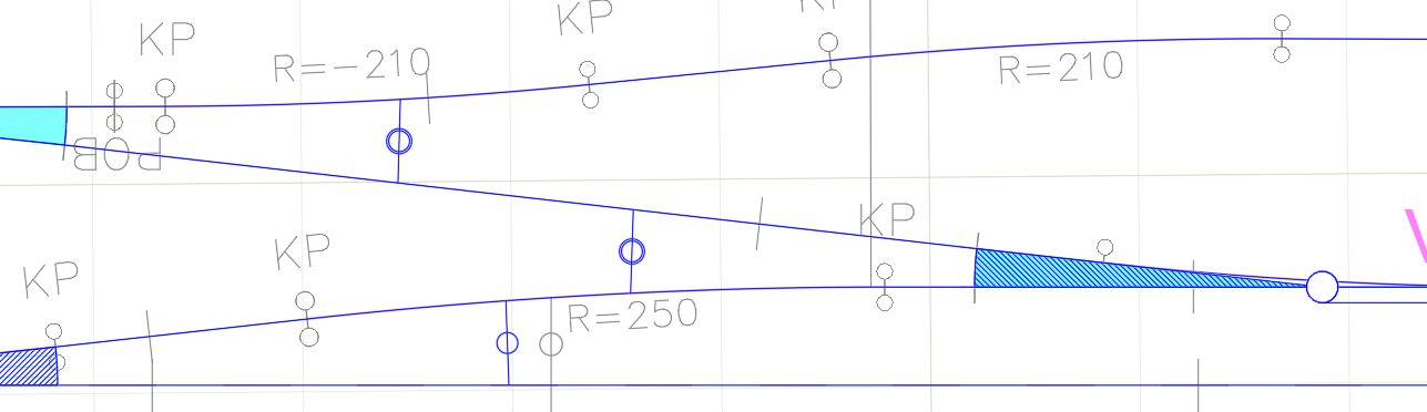RailCOMPLETE calculates fouling points in connection with switches, based on the actual track geometries extending from the switch. Visualization of fouling points can be turned on and off as needed. RailCOMPLETE comes with a built-in function for fouling point calculation, so that fouling point information can be included in model checks and in tables.